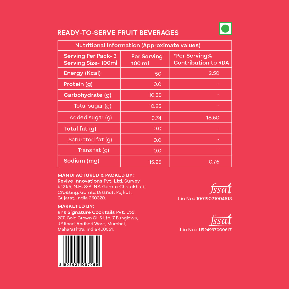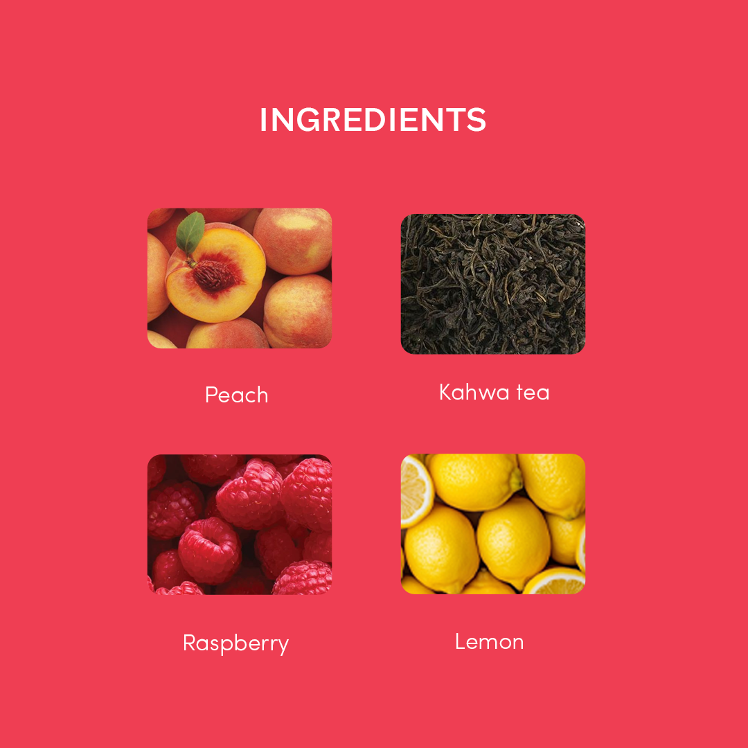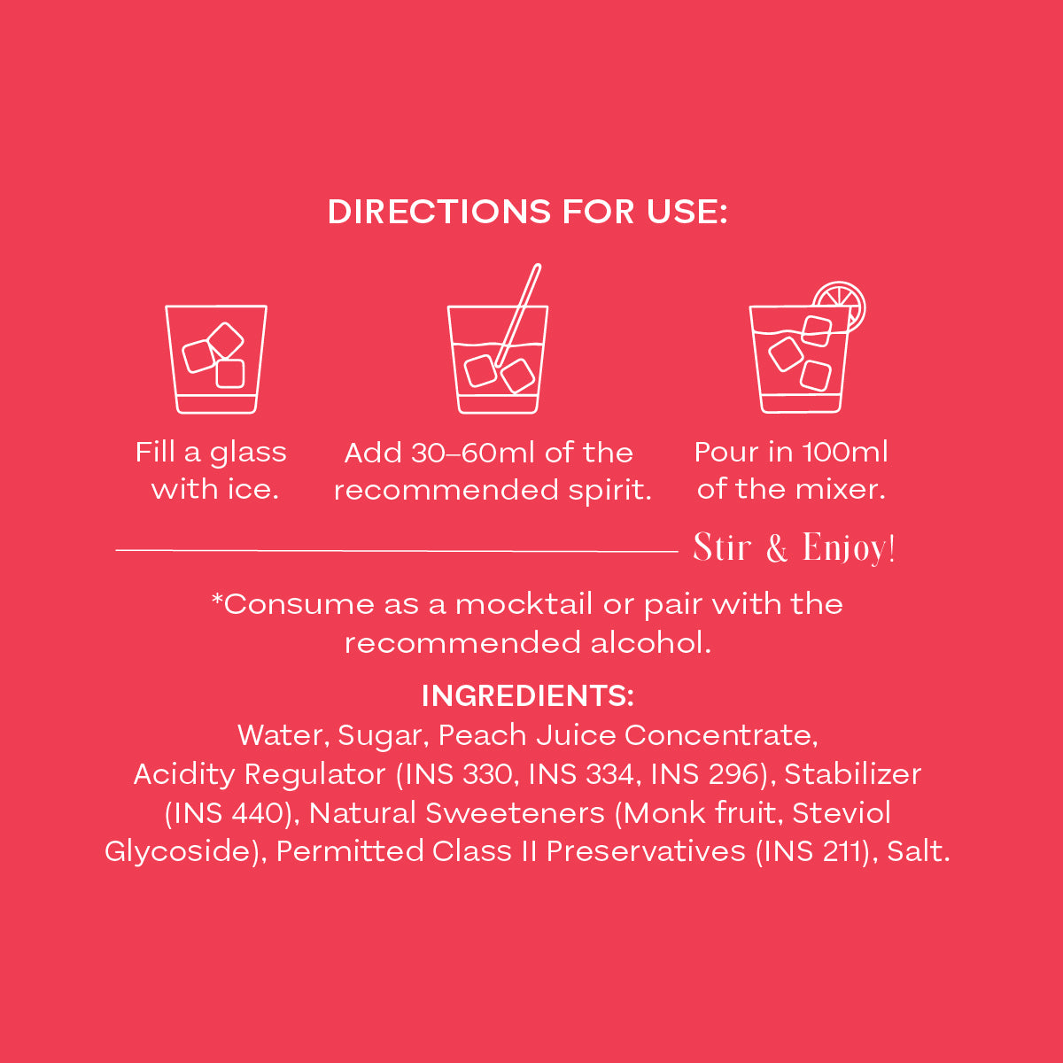 Water. Sugar, Peach Juice Concentrate, Acidity Regulator (INS 330, INS 334, INS 296). Stabilizer (INS 440), Natural Sweeteners (Monk fruit, Steviol Glycoside). Permitted Class II Preservatives (INS 211), Salt.