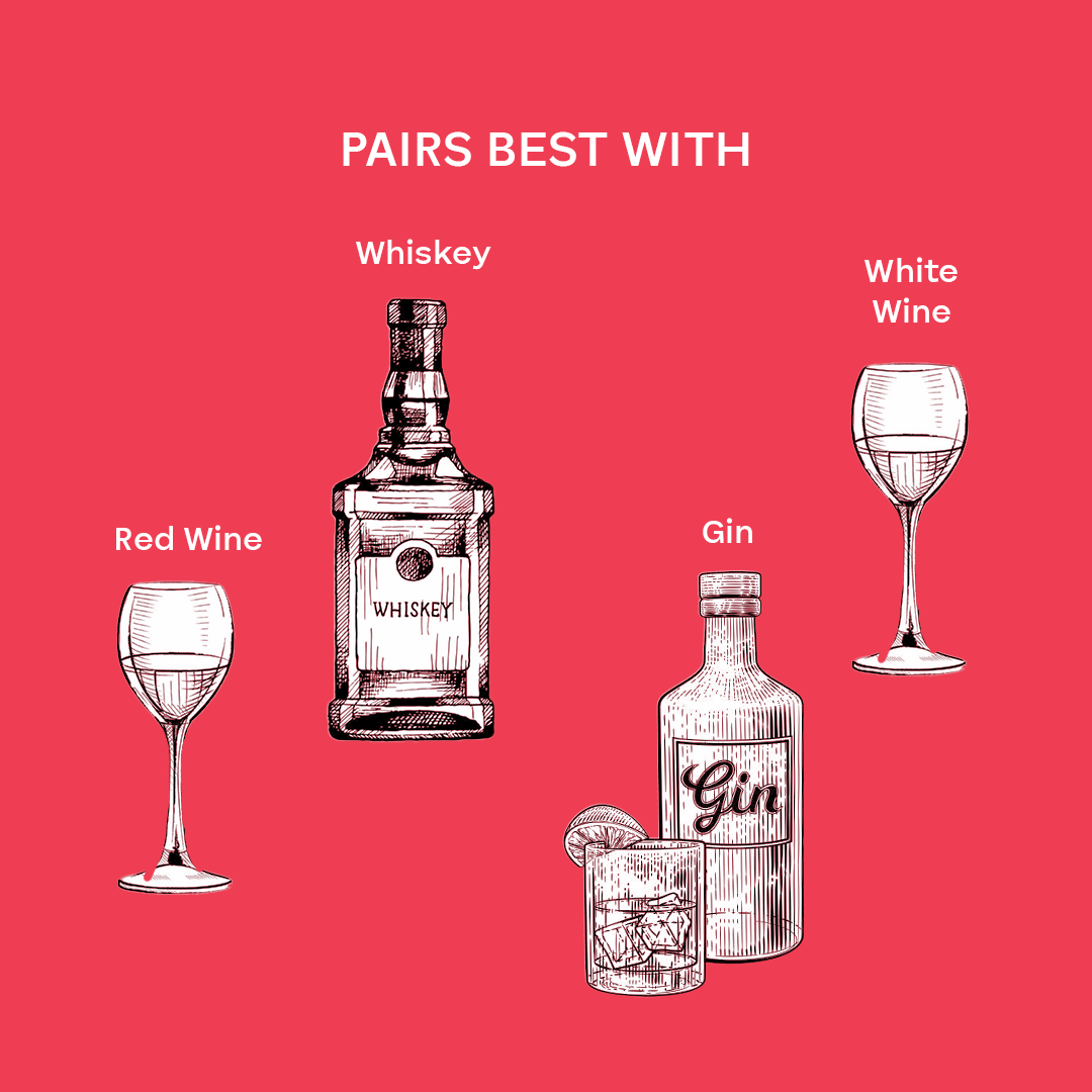 Pairs best with Red Wine and White Wine, Whisky and Gin.