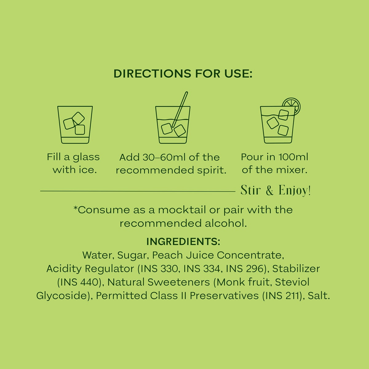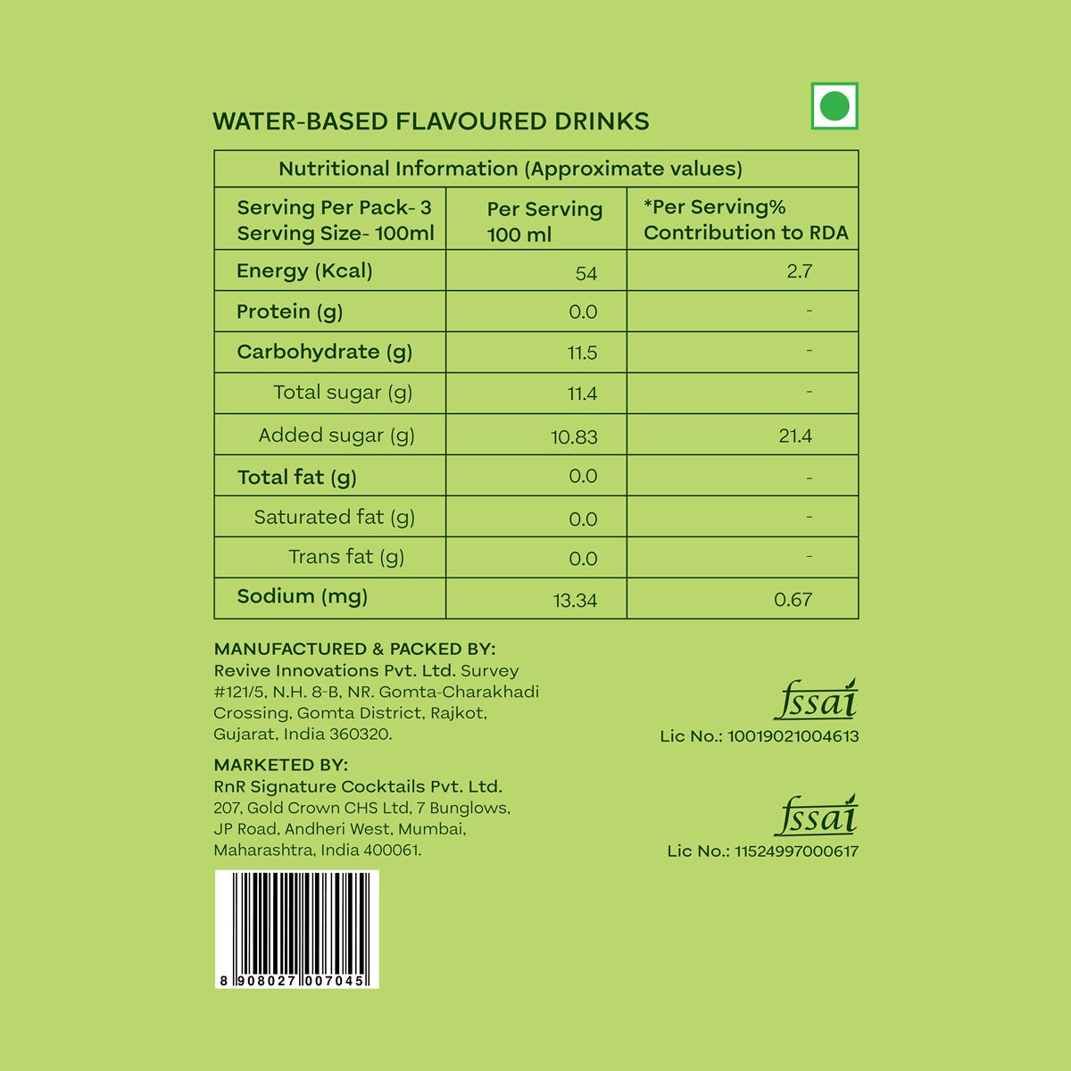 Water, Sugar, Acidity Regulator (INS 330, INS 334, INS 296), Stabilizer (INS 440). Natural Sweeteners (Monk Fruit, Steviol Glycoside). Permitted Class II Preservatives (INS 211), Salt.