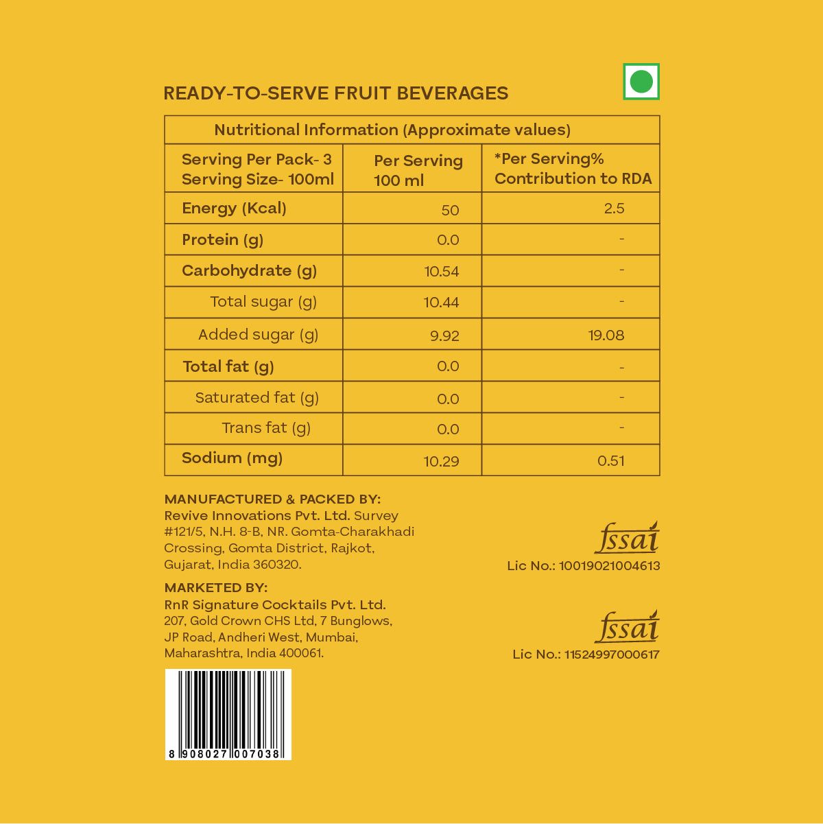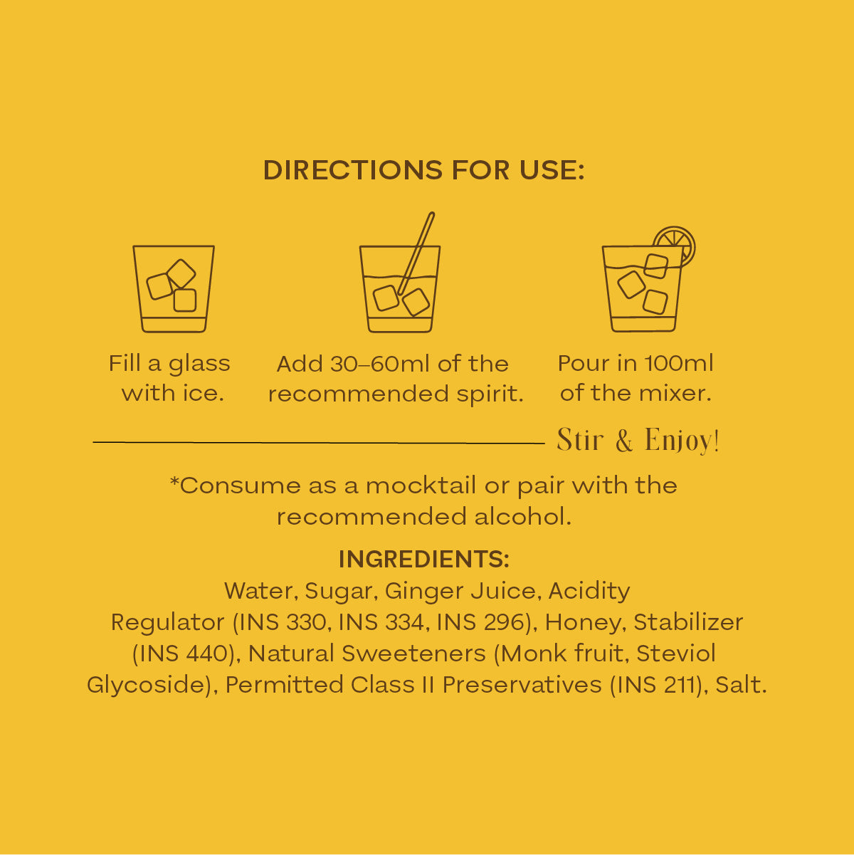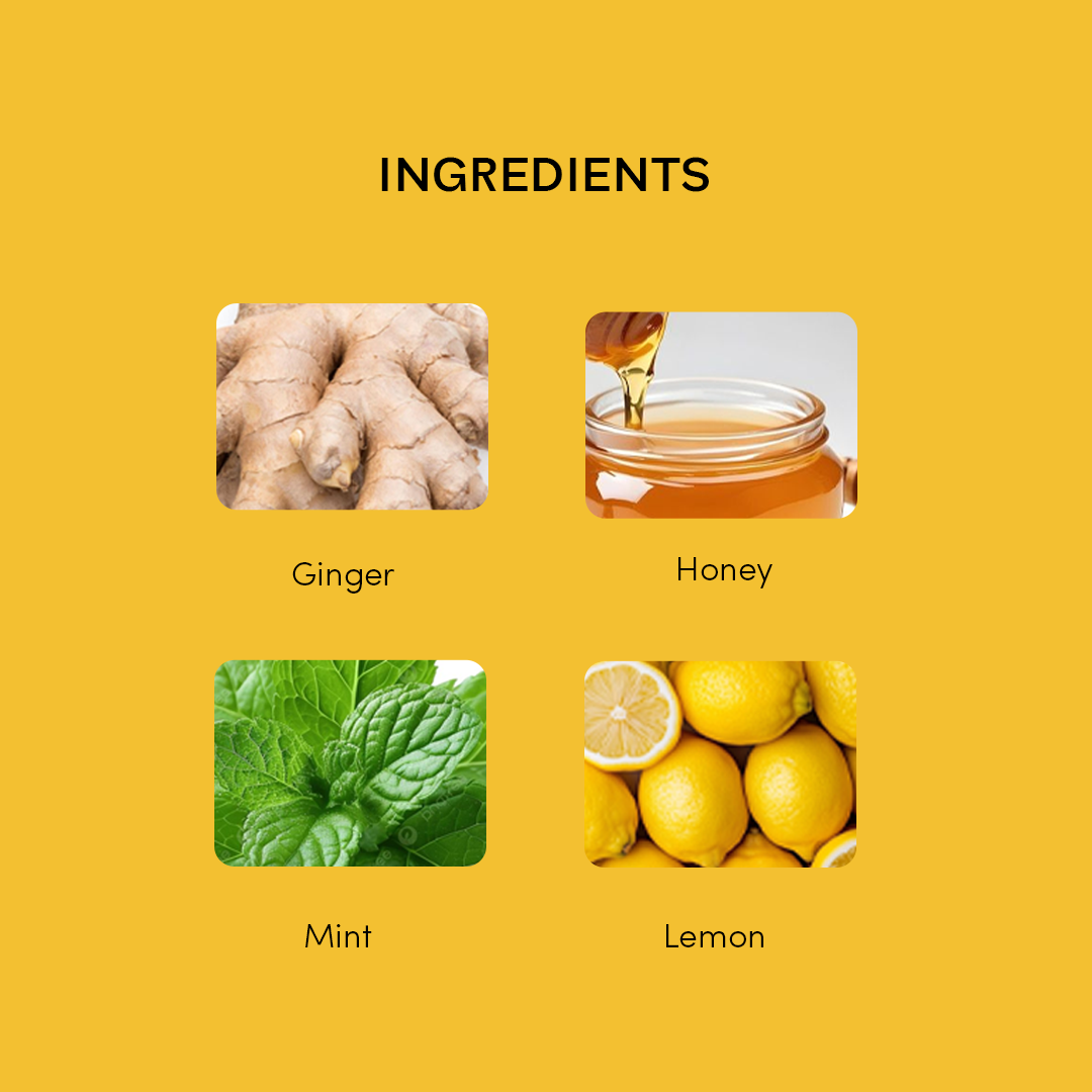 Water, Sugar, Ginger Juice. Acidity Regulator (INS 330. INS 334, INS 296). Honey, Stabilizer (INS 440), Natural Sweeteners (Monk fruit, Steviol Glycoside). Permitted Class II Preservatives (INS 211), Salt.Â